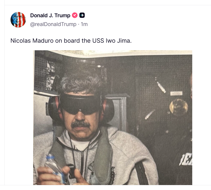 △特朗普在社交媒体发布马杜罗在美军舰上戴手铐、双眼被蒙住的照片