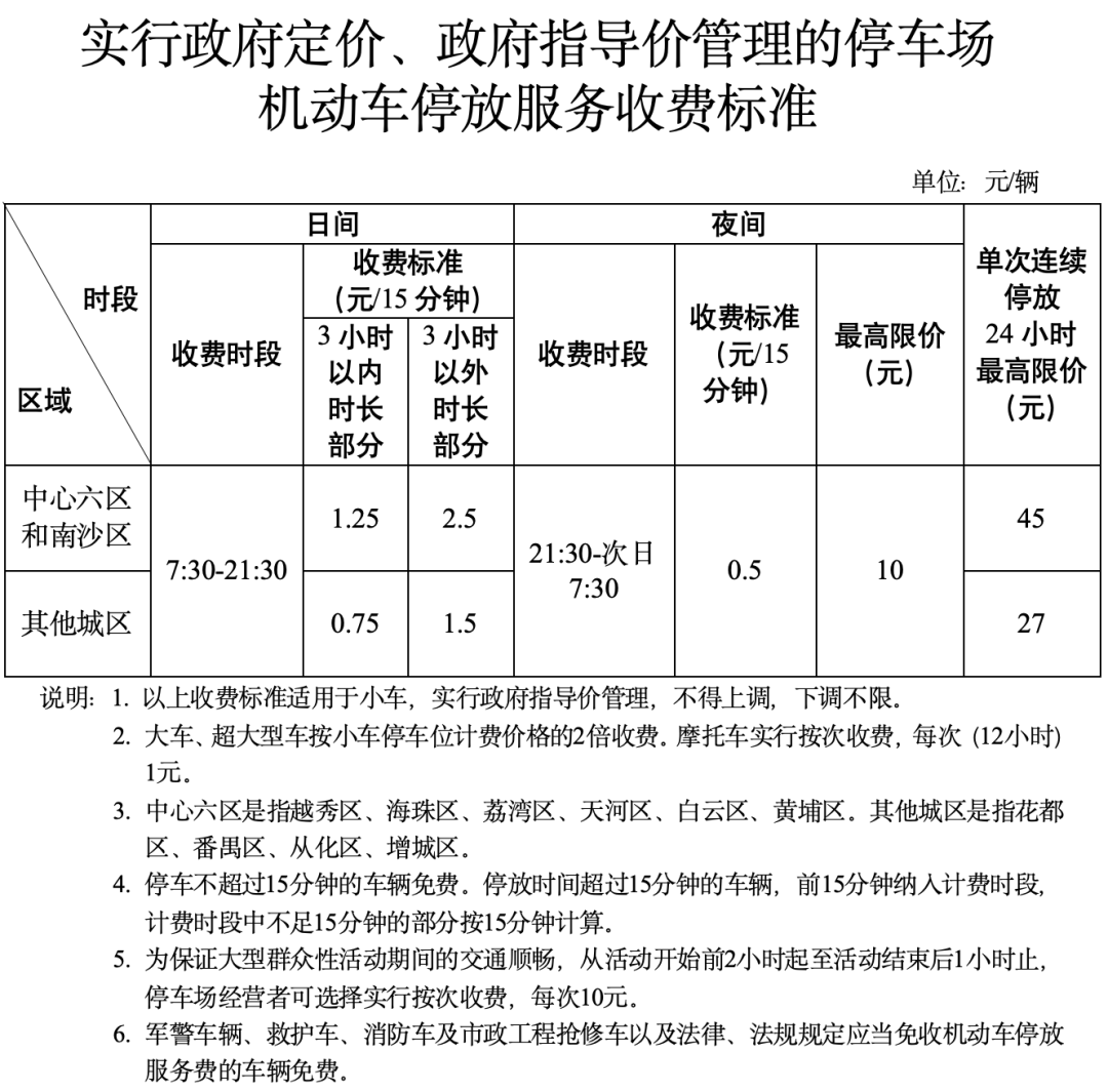 根据《管理办法》,实行政府定价、政府指导价管理的停车场,中心六区(越秀区、海珠区、荔湾区、天河区、白云区、黄埔区)和南沙区实行同档收费标准,日间时段,3小时内收费为1.25元/15分钟,3小时以外收费为2.5元/15分钟;夜间时段收费为0.5元/15分钟,最高不超过10元。其他城区(花都区、番禺区、从化区、增城区)由所在区发展改革部门按照“不高于中心六区收费标准”的原则制定收费标准。