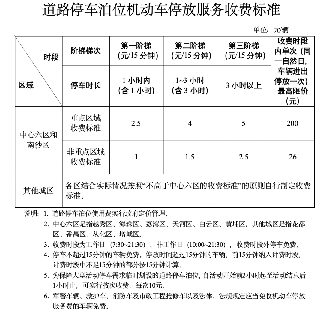 在全天准停道路停车泊位使用费方面,中心六区和南沙区按照重点区域、非重点区域实行阶梯收费,重点区域单次最高限价为200元,非重点区域最高限价为26元。其他各区结合实际情况按照“不高于中心六区的收费标准”的原则自行制定收费标准。