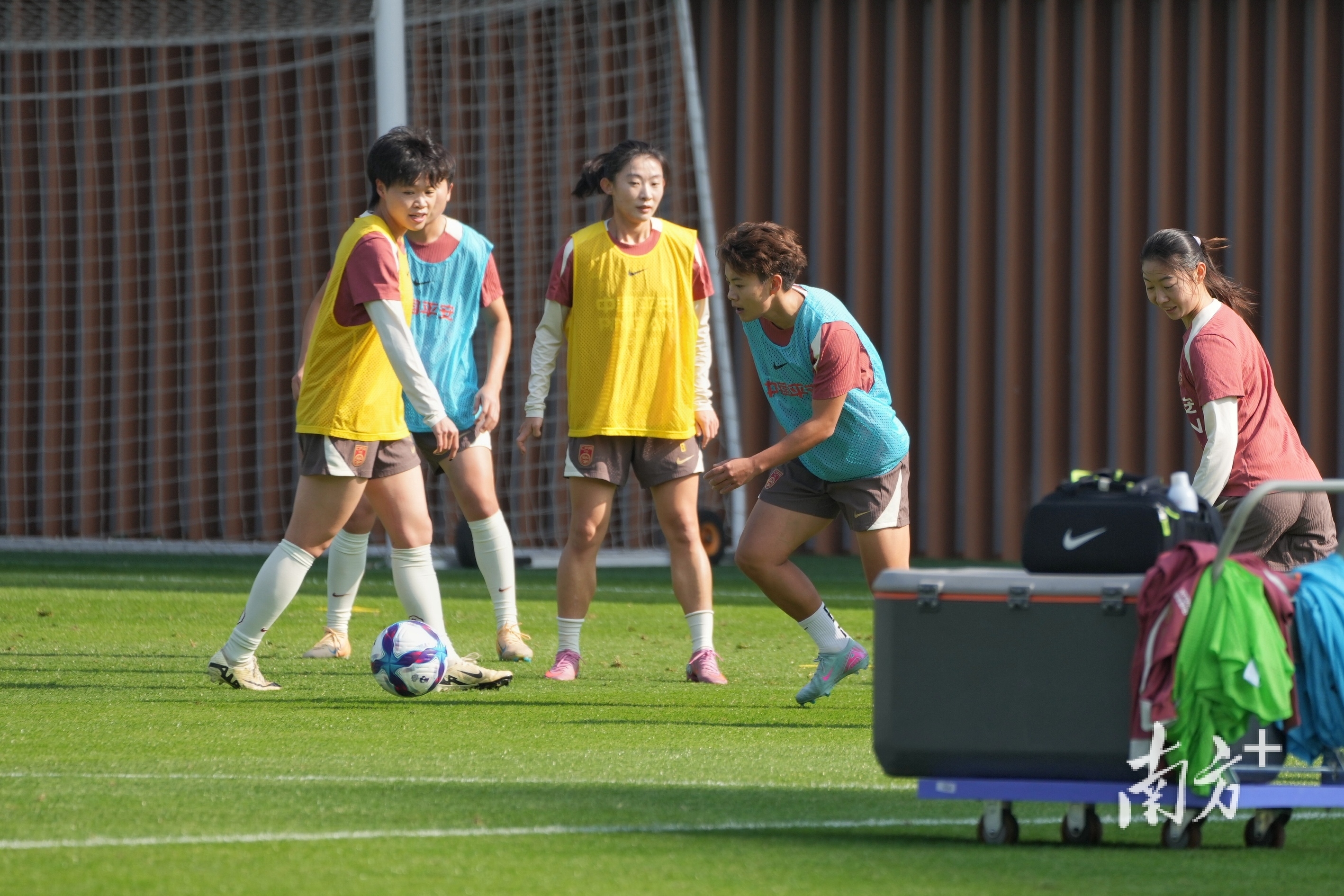 在对媒体开放的半个小时左右时间里,记者在场边看到,姑娘们先是进行了慢跑热身和关节活动,随后分组进行对抗训练。训练场上气氛轻松,不时传来队员们互相打气的鼓励声。