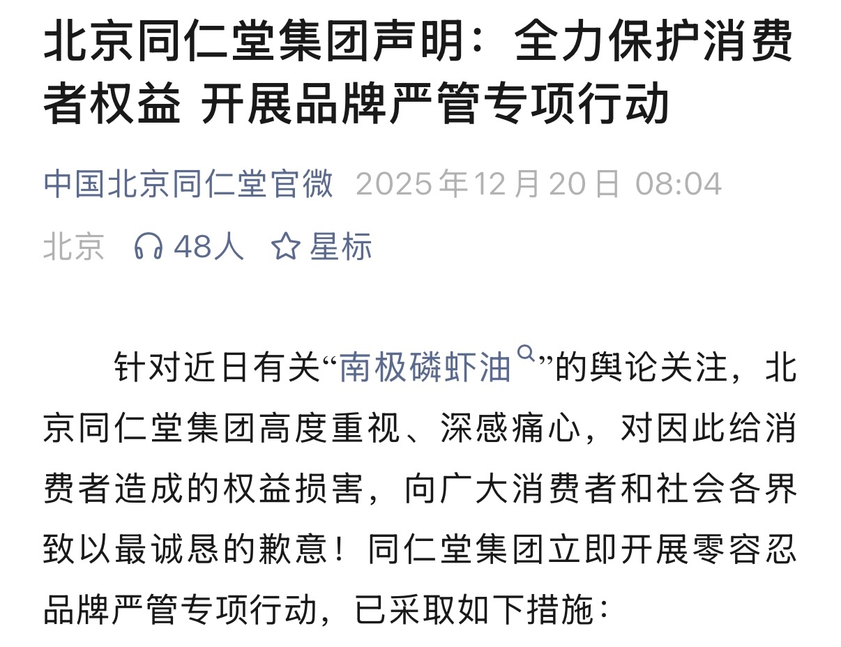 12月20日,针对近日备受消费者关注的“南极磷虾油”事件,北京同仁堂集团发布声明并致歉。