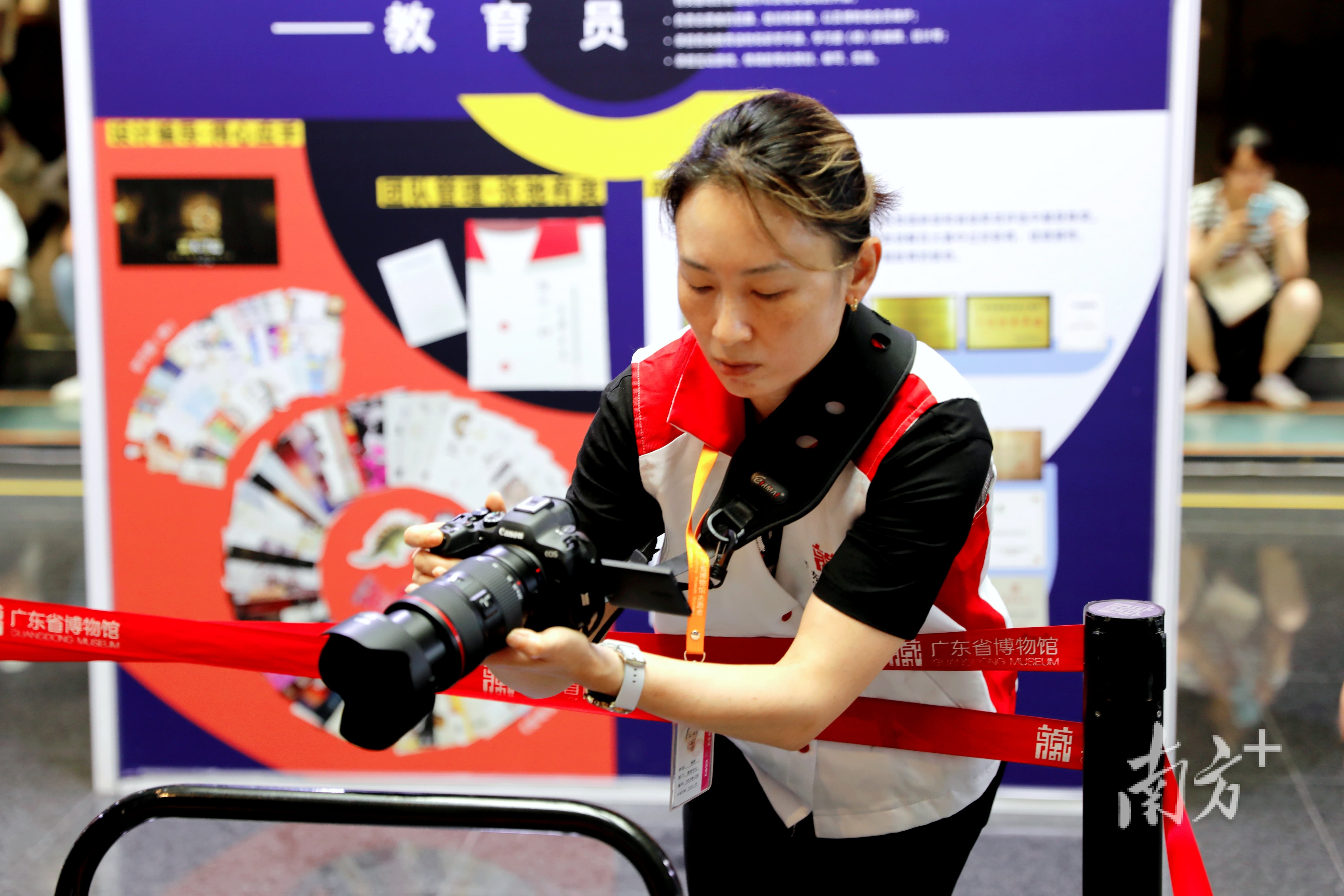 一个凉爽的夏日午后,在广东省博物馆(下简称“粤博”)志愿者活动室门口,卢莎莉略显紧张地等待拍摄。当摄影师说“准备开拍”时,她郑重地摆正了胸前的“金牌志愿者”徽章。