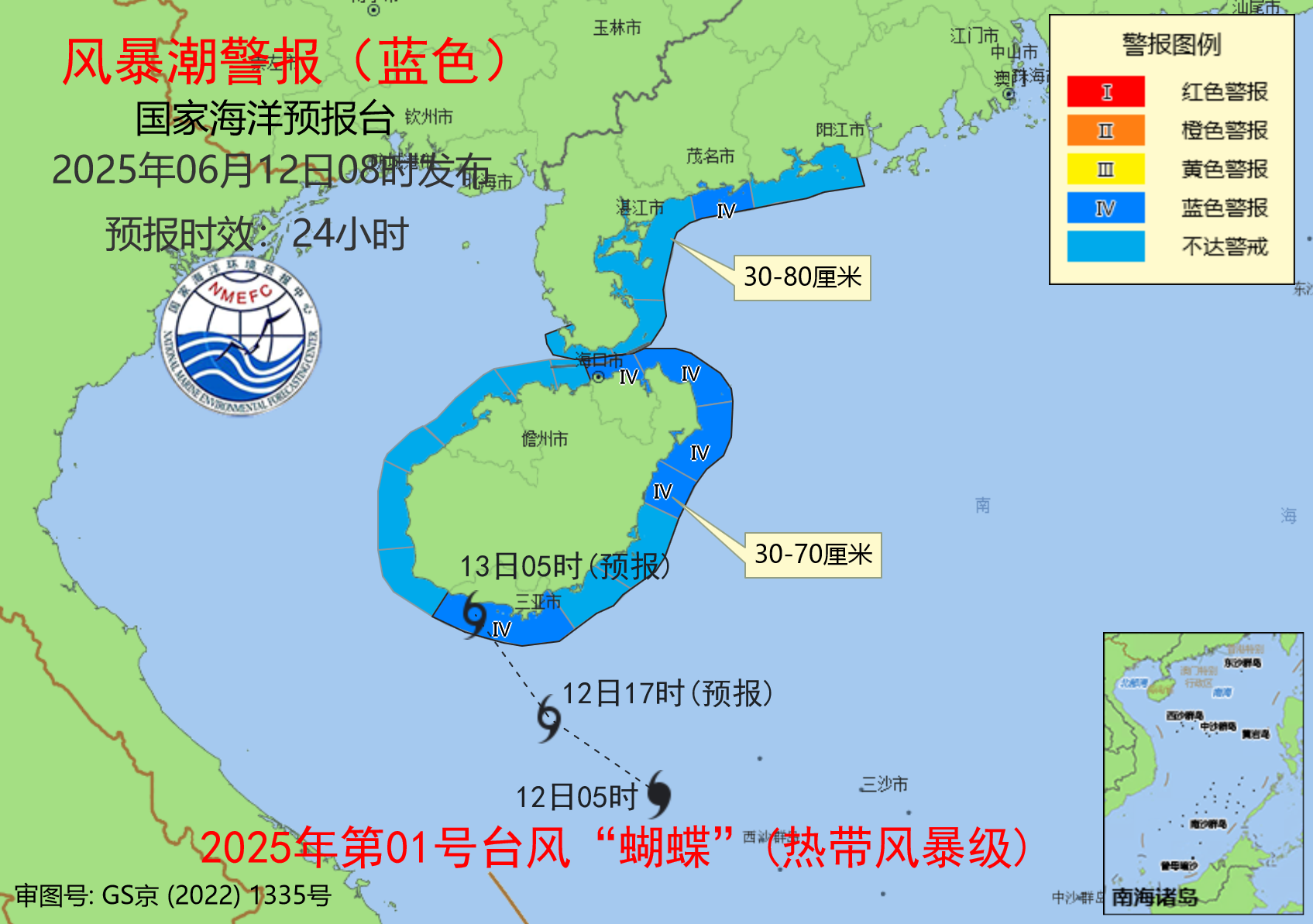 国家海洋预报台根据《海洋灾害应急预案》,发布风暴潮蓝色警报。受今年第1号台风“蝴蝶”(热带风暴级)的影响,预计:6月12日上午至13日上午,海南岛沿海将出现30到70厘米的风暴增水,广东阳江到雷州半岛东岸沿海将出现30到80厘米的风暴增水。广东省茂名市、海南省海口市、文昌市、琼海市和三亚市的风暴潮预警级别为蓝色。上述岸段正处天文大潮期,请沿海政府及相关部门按照职责做好防御风暴潮的应急准备工作;各涉海相关生产单位采取积极有效的措施,组织渔船、养殖渔排、养殖场等做好防御工作;加固沿海渔业养殖水产设施和渔港设施,做好防潮准备。