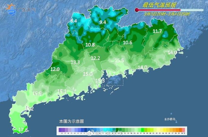 4日,西部市县阴天间多云转小到中雨,其余市县多云到阴天,有小雨,大部分市县气温回升,伴有(轻)雾和回南天。最低气温:粤北大部、粤东北部市县11℃~14℃,其余市县15℃~18℃。