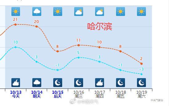 14-15日,内蒙古中东部、东北地区气温将下降6~10℃,局地降温幅度超过12℃;如哈尔滨昨天最高温还有23℃,明天就剩下9℃了。16日早晨,哈尔滨、长春最低气温还可能首次跌破0℃。