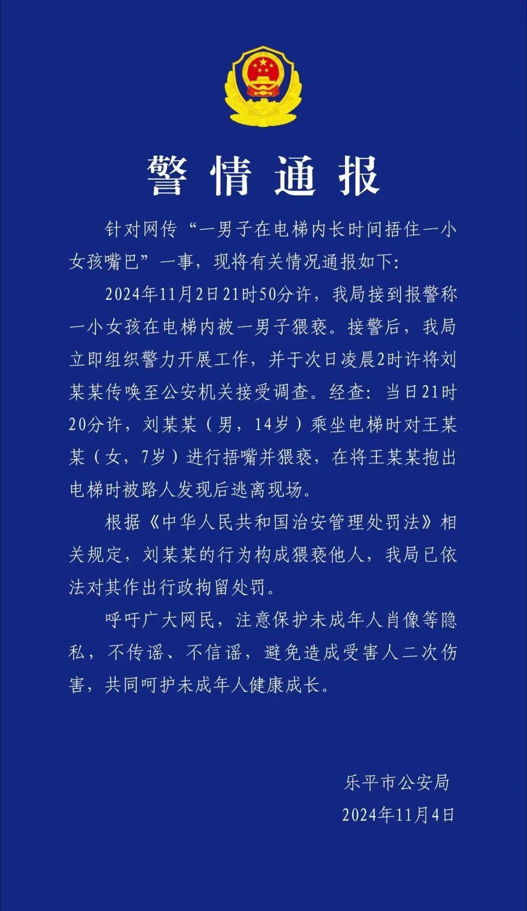 2024年11月2日21时50分许,我局接到报警称一小女孩在电梯内被一男子猥亵。接警后,我局立即组织警力开展工作,并于次日凌晨2时许将刘某某传唤至公安机关接受调查。经查:当日21时20分许,刘某某(男,14岁)乘坐电梯时对王某某(女,7岁)进行捂嘴并猥亵,在将王某某抱出电梯时被路人发现后逃离现场。