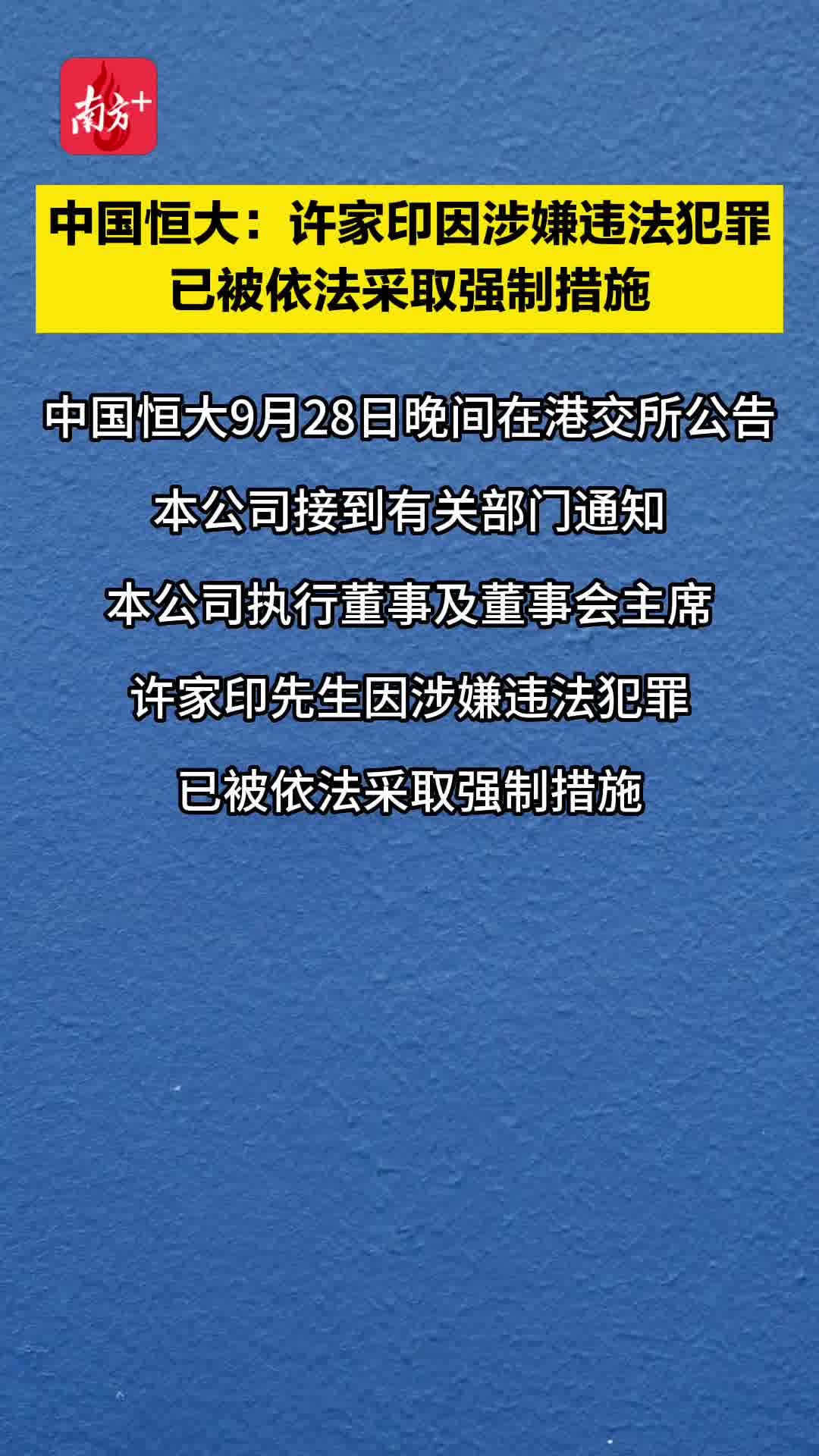 中国恒大:许家印因涉嫌违法犯罪,已被依法采取强制措施