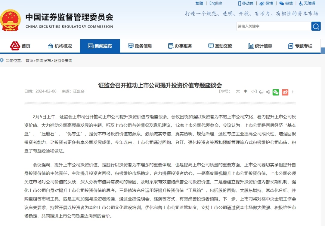 据证监会网站2月6日消息,2月5日上午,证监会上市司召开推动上市公司提升投资价值专题座谈会。