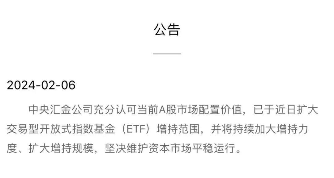 2月6日,中央汇金公司发布公告称,充分认可当前A股市场配置价值,已于近日扩大交易型开放式指数基金(ETF)增持范围,并将持续加大增持力度、扩大增持规模,坚决维护资本市场平稳运行。