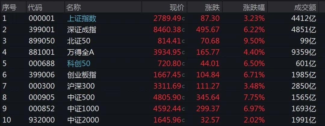 截至收盘,上证指数涨3.23%,报2789.49点;深证成指涨6.22%,报8460.38点;创业板指涨6.71%,报1667.45点。沪深两市成交额突破9000亿元。