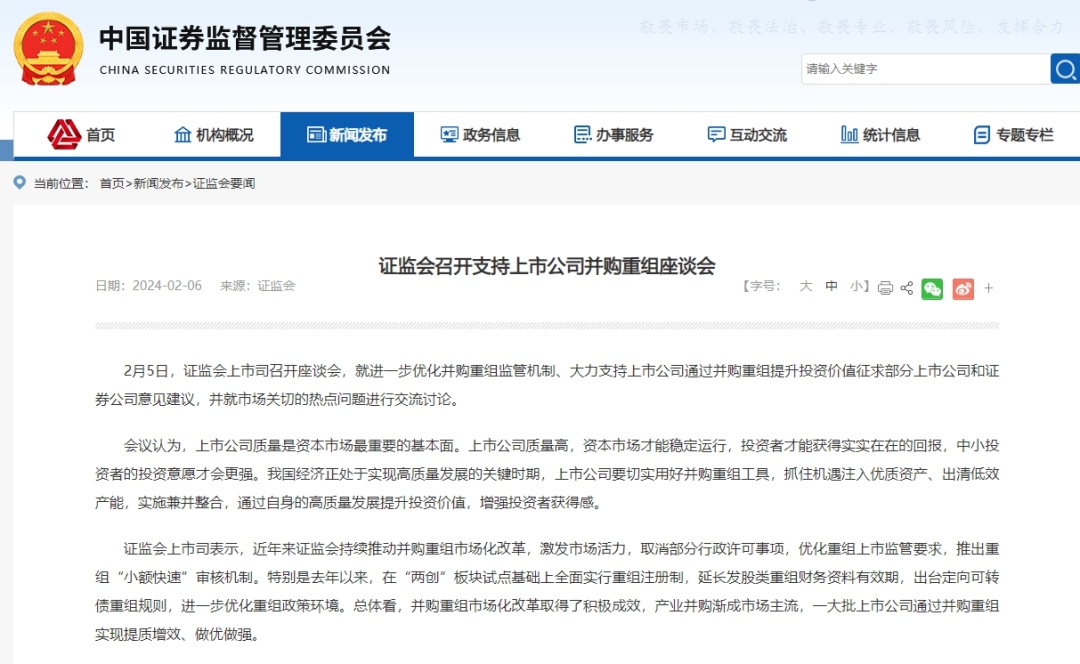 另外,2月5日,证监会上市司召开座谈会,就进一步优化并购重组监管机制、大力支持上市公司通过并购重组提升投资价值征求部分上市公司和证券公司意见建议,并就市场关切的热点问题进行交流讨论。