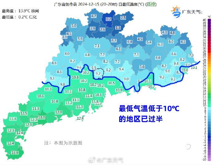 根据广东省气象部门监测,12月15日早晨粤北、珠三角北部大部分市县最低气温介于2~6℃,其中韶关仁化录得全省国家基本气象站最低气温0.2℃,粤北高寒山区15日早晨最低气温介于-3~0℃。从15日早晨广东各地国家基本气象站最低气温数据判断,15日早晨广东超过一半地区最低气温在10℃以下。在广州,广州国家基本气象站15日早晨最低气温9.2℃,从化吕田北部山区多个自动气象站最低气温介于3~5℃。