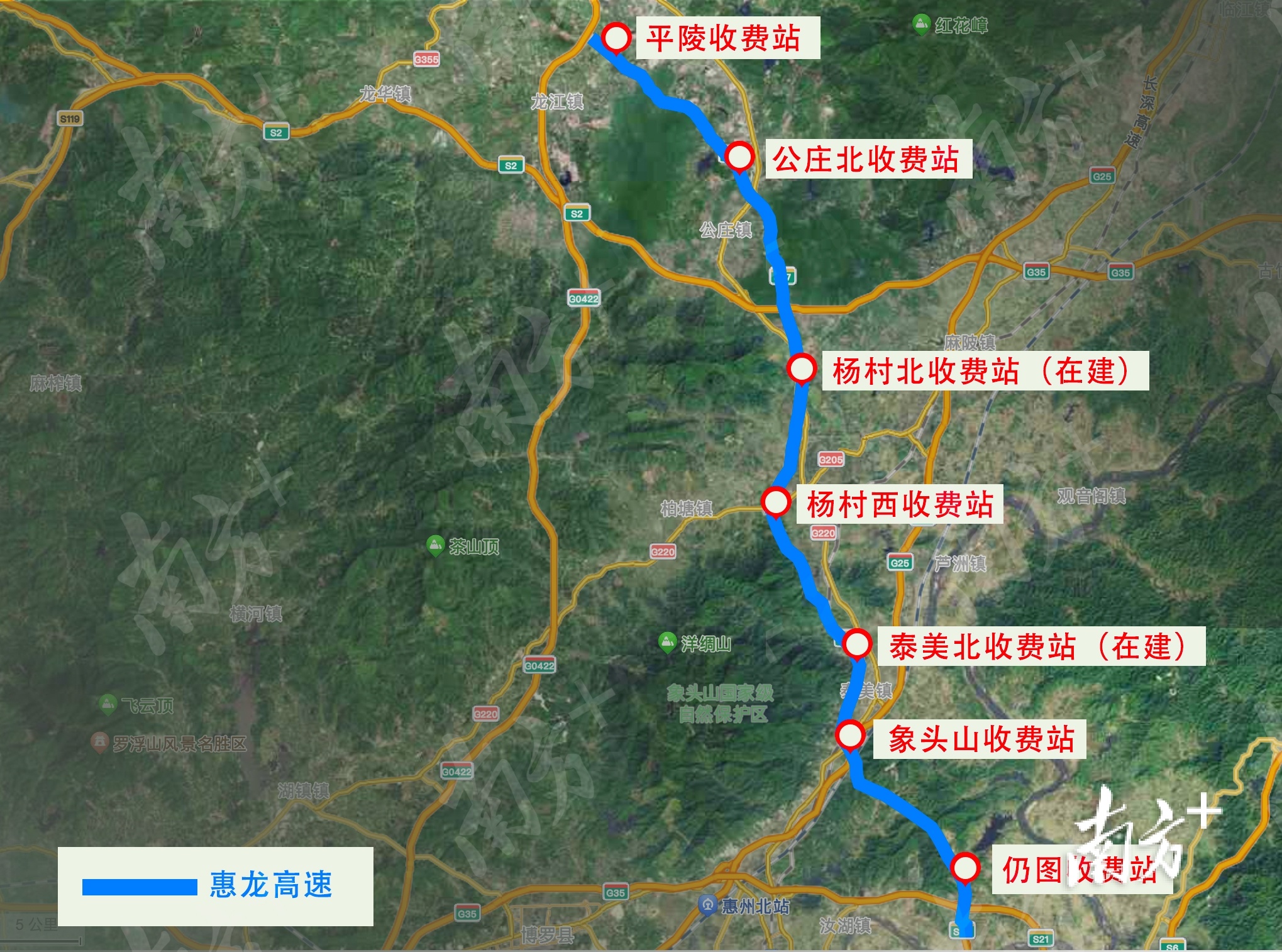 惠龙高速项目全线均在惠州市境内,起点在龙门县平陵X218附近接入武深高速,终点对接已通车的惠大高速公路。线路大致呈北向南走,途经龙门县平陵街道,博罗县公庄镇、杨村镇、杨侨镇、柏塘镇、泰美镇、罗阳街道,惠城区汝湖镇,设平陵、公庄北、杨村西、杨村北(预留)、泰美北(预留)、象头山、仍图7处收费站。