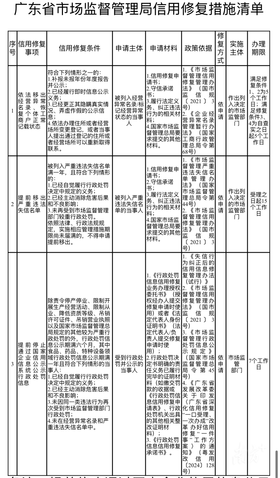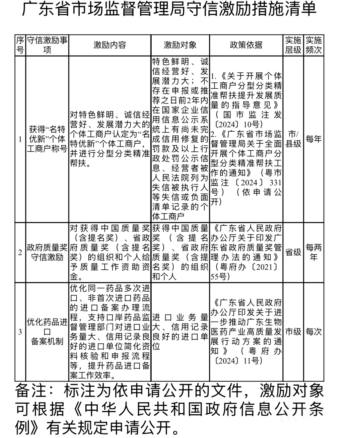 近日,广东省市场监督管理局正式编制印发省级守信激励、失信惩戒和信用修复措施“三张清单”,完善市场监管领域的守信激励、失信惩戒和信用修复机制,进一步健全以信用为基础的市场监管体系,引导更多经营主体守信、重信、诚信,助力打造“守信有激励、失信必惩戒、信用可修复”的社会环境。