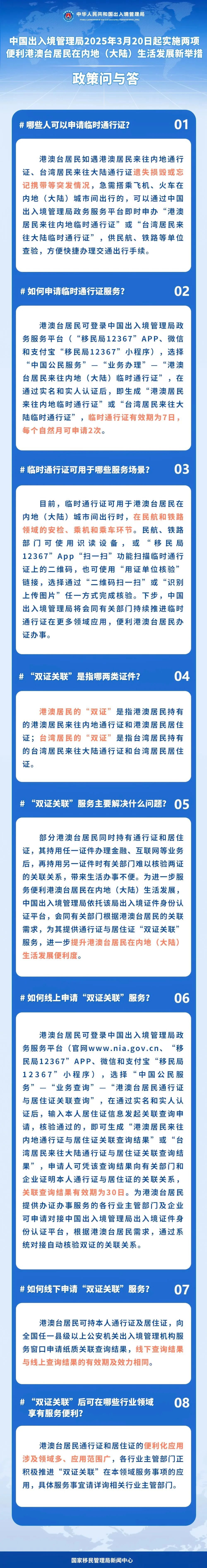 中国出入境管理局决定,从2025年3月20日起,为有需求的港澳台居民签发来往内地(大陆)临时通行证,并提供来往内地(大陆)通行证与居住证“双证关联”核验服务。