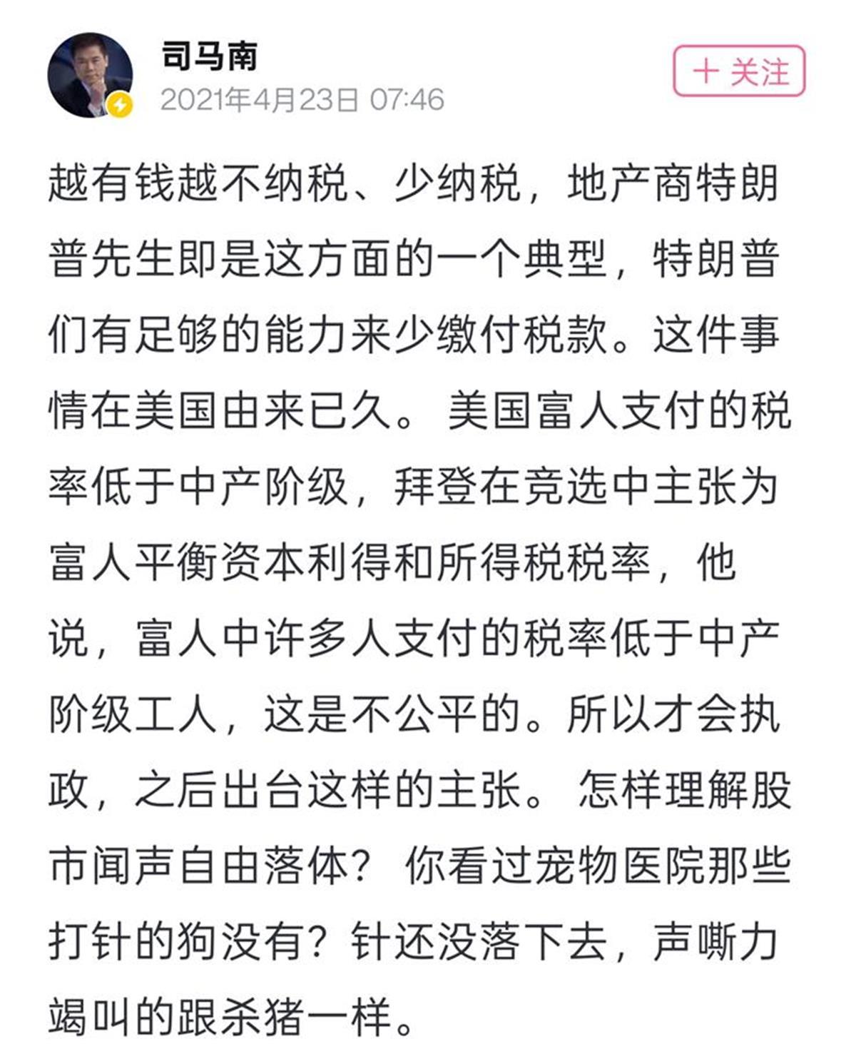 2021年4月23日,司马南发文痛批美国富人税务问题,“越有钱越不纳税、少纳税”。