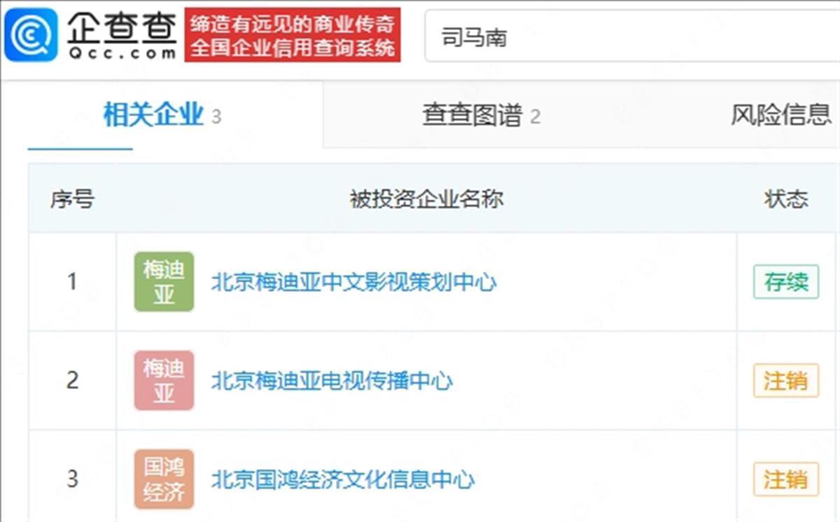 另据企查查APP显示,司马南关联有三亚崖州司马南文化工作室、北京梅迪亚中文影视策划中心、北京梅迪亚电视传播中心(注销)等多家公司。