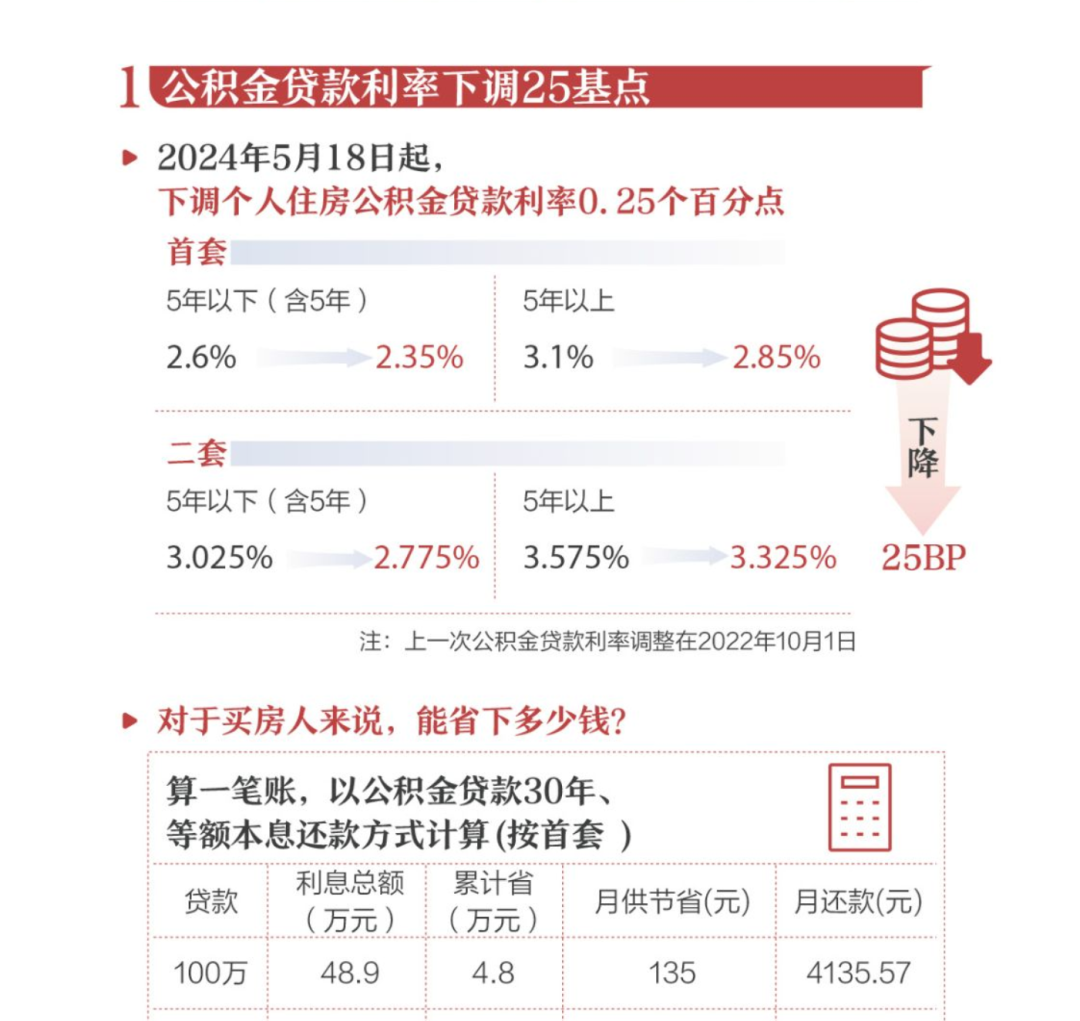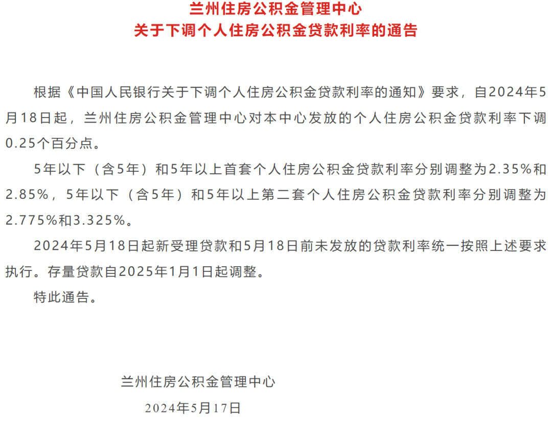 5月17日,央行决定自2024年5月18日起,下调个人住房公积金贷款利率0.25个百分点,5年以下(含5年)和5年以上首套个人住房公积金贷款利率分别调整为2.35%和2.85%,5年以下(含5年)和5年以上第二套个人住房公积金贷款利率分别调整为不低于2.775%和3.325%。