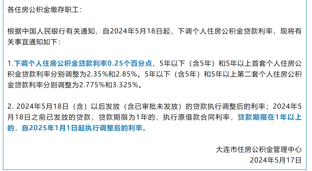 部分城市对存量调整还有附加的期限要求。比如,成都市和大连市要求,2024年5月18日之前发放的住房公积金贷款,贷款期限在1年以上的,贷款利率将在2025年1月1日进行调整;贷款期限为1年的,贷款利率不作调整。