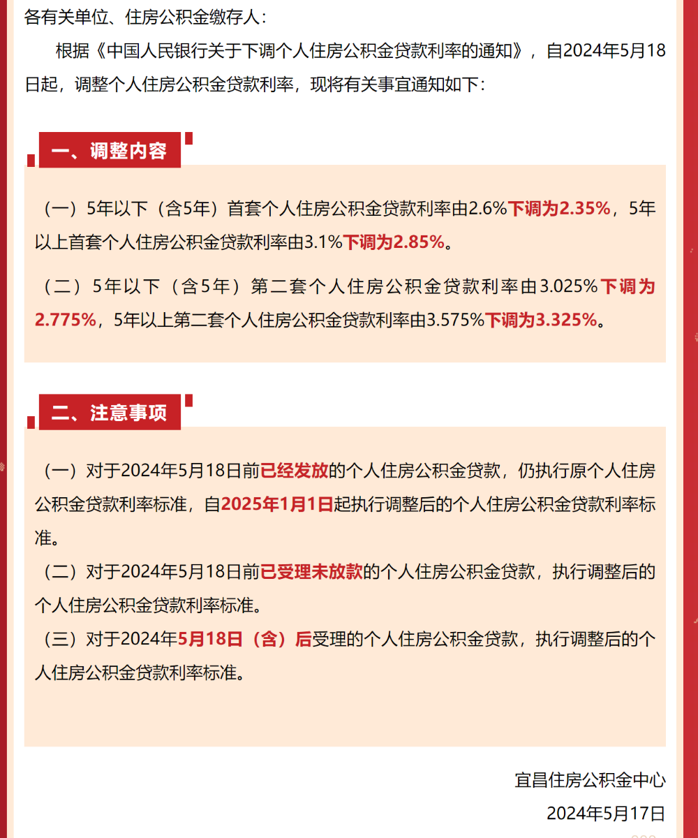 2、对于2024年5月18日前已受理未放款的个人住房公积金贷款,执行调整后的个人住房公积金贷款利率标准。(记者注:新增公积金贷款)