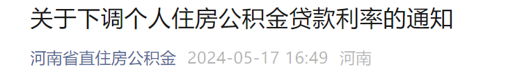 5月17日,“河南省直住房公积金”公众号发布了《关于下调个人住房公积金贷款利率的通知》。