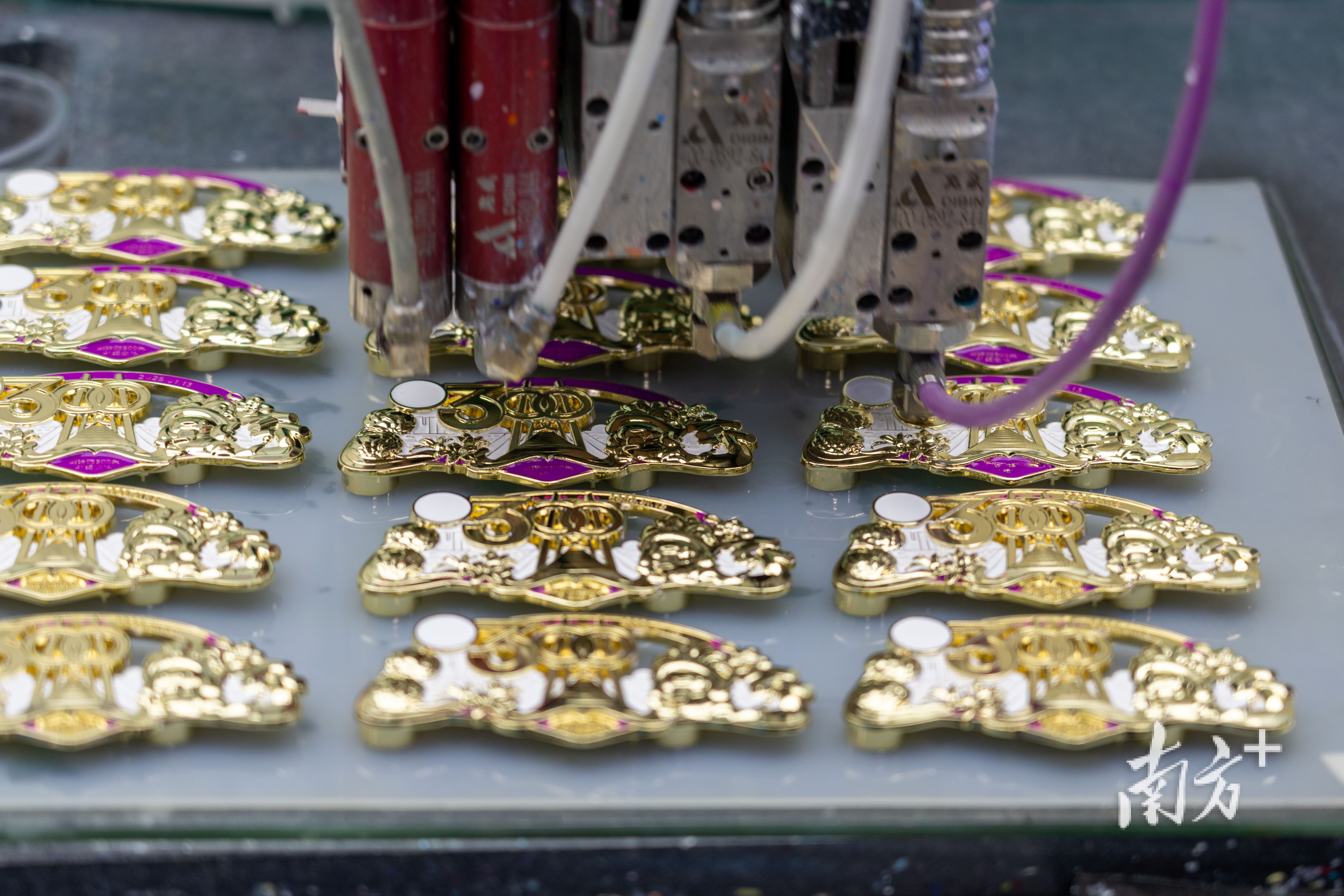 在深圳的另一家工厂,随着机器的轰隆声,十五运会的冰箱贴源源不断地从生产线上“出生”。