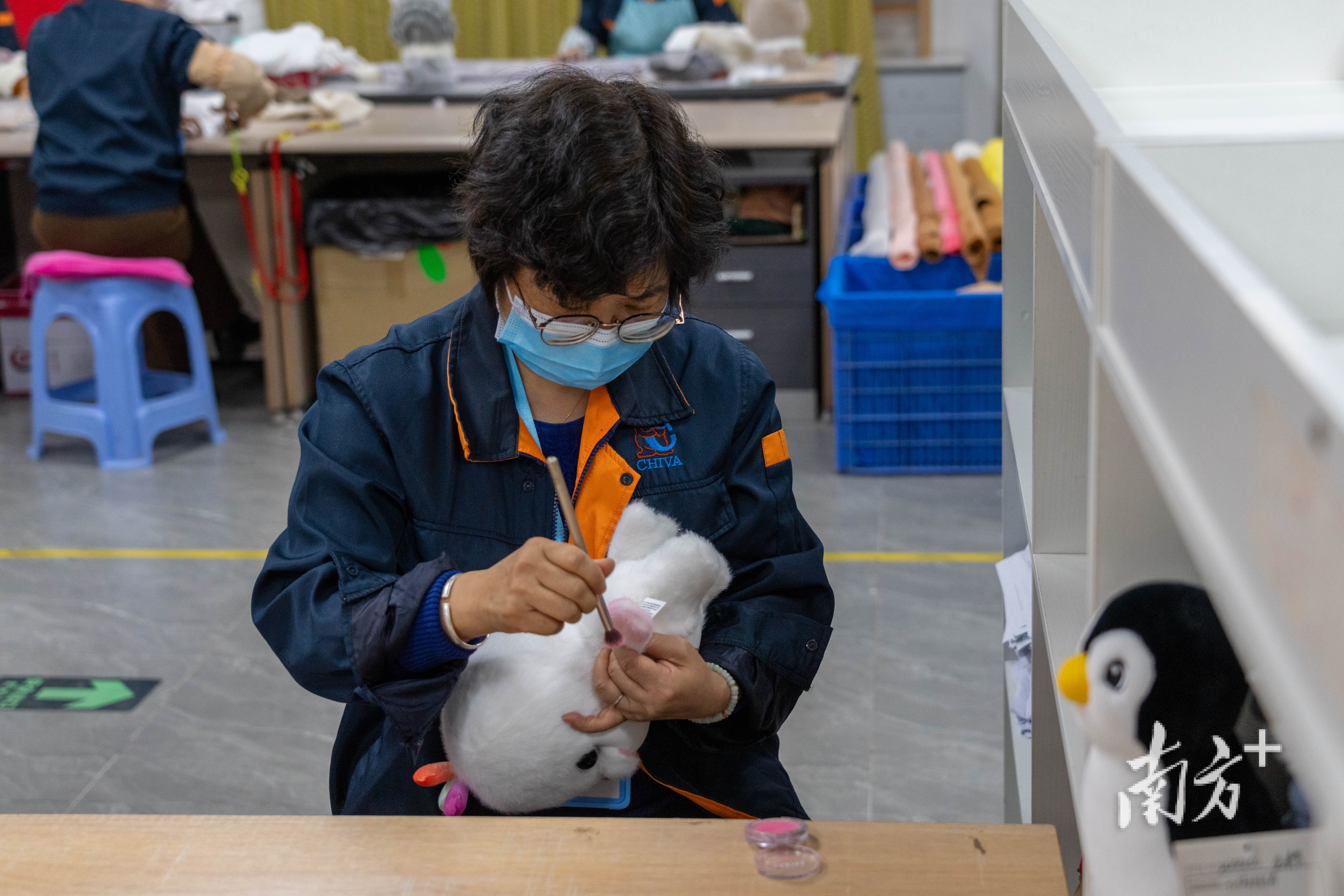 生产车间内,不少工人正在加紧赶工,有的在忙着缝制毛绒外皮,有的在加紧为吉祥物缝上水花,还有的在为吉祥物塞入填充物。