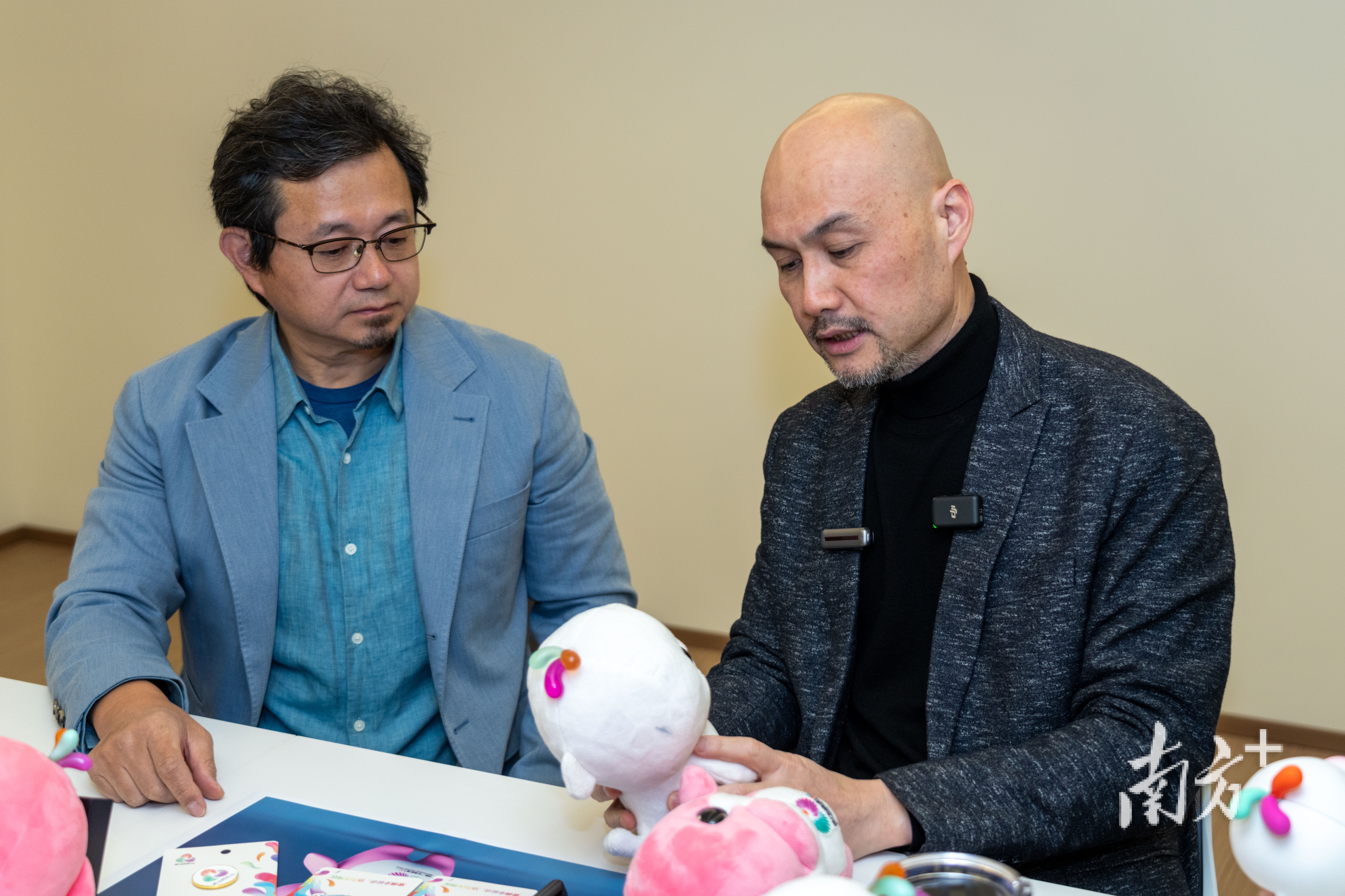 “这家工厂生产过‘冰墩墩’等众多奥运会、世界杯的吉祥物毛绒玩具,经验和实力都是广受认可的。这一次,我们希望用‘多材质’的方式进行表达。毛绒是吉祥物全身的基础材质,头顶的水花则用PVC,彰显设计特色。”刘平云介绍,“我希望它首先能最真切地还原设计意图,包括色彩、造型、材质等。整体来看还是满意的。”