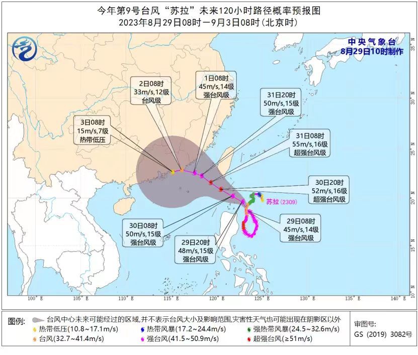 8月29日14时至30日14时,巴士海峡、台湾海峡、台湾以东洋面偏南海域将有6至8级阵风、9至10级的大风,其中巴士海峡海域风力可达9至10级,部分海域风力可达11至13级,“苏拉”中心经过的附近海面的风力有14至16级、阵风17级及以上,请过往船只注意航行安全。