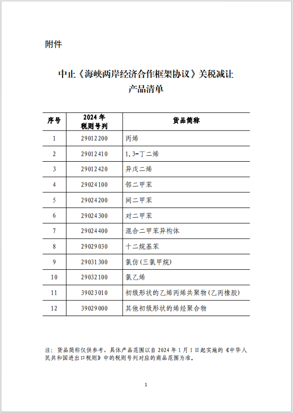 自2024年1月1日起,对原产于台湾地区的附件所列丙烯、对二甲苯等12个税目进口产品,中止适用《海峡两岸经济合作框架协议》协定税率,按现行有关规定执行。