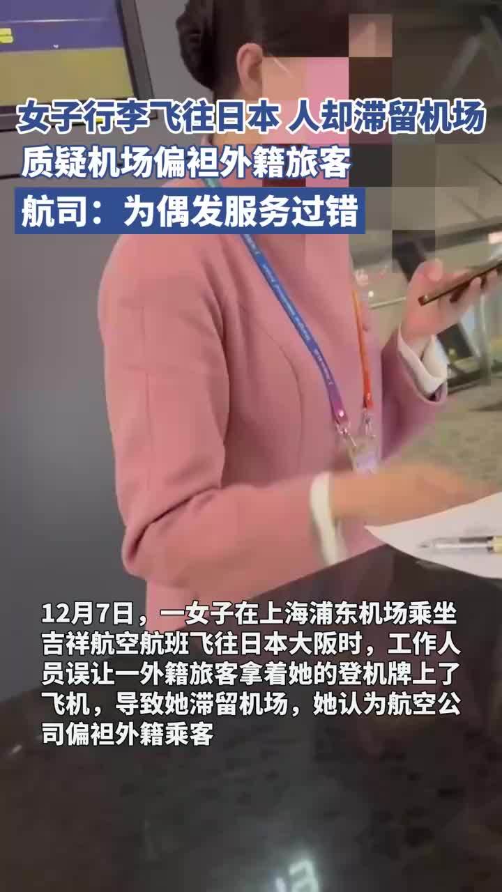 12月7日,一女子发视频称,她在上海浦东机场乘坐吉祥航空航班飞往日本大阪时,工作人员让和她一起迟到的一名外籍旅客上了飞机,却让她滞留在机场,她认为航空公司偏袒外籍乘客。9日下午,吉祥航空针对此事回应记者称,12月7日,公司执行HO1337浦东至大阪的航班,在登机过程中发生因工作人员失误导致旅客行程受影响事件。此事件为偶发服务过错,不存在偏袒外籍旅客的行为。详情>>