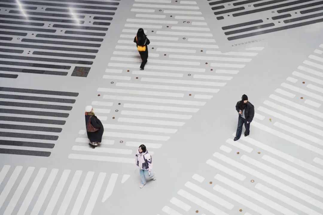 作为国内单体建筑面积最大的图书馆,上图东馆的自我定位是藏书、借阅以及开放的文化艺术空间。中庭地面是艺术家申凡创作的《往来春秋》,以《申报》报纸版面为灵感,保留标点符号,文字抽象为色带。水磨石黑白分明,从上往下看,这是一条平均每天被1.12万人走过的细长斑马线。