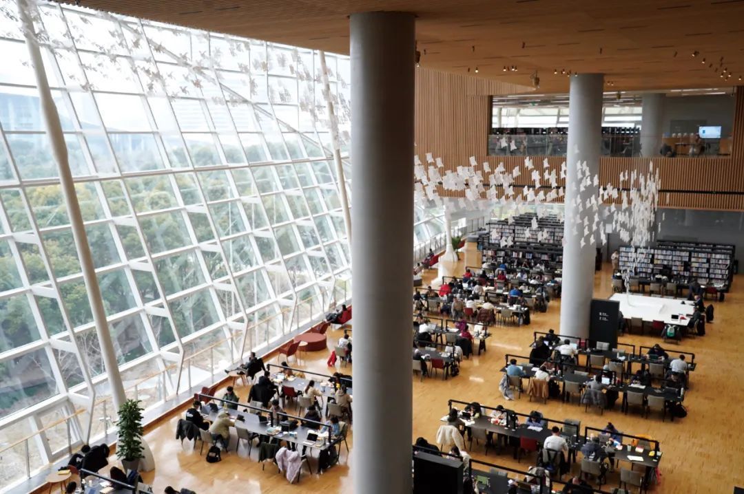 ▲上海图书馆 (东馆) 三楼南阅读广场,徐冰的艺术装置 《鸟飞了》 悬于空中