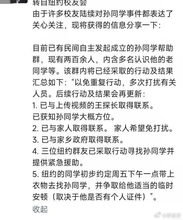 目前,已有民间自主发起成立的“孙同学帮助群”,位于纽约的群友已采取行动寻找孙同学并提供紧急援助,为保护其隐私,志愿者行动不便公开。同时,校友会已与孙姓校友的家人和家乡政府取得联系,其家人目前不希望被打扰。