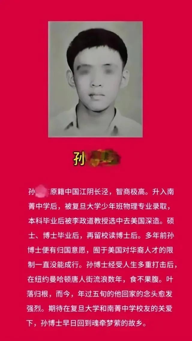 1月4日下午,有江阴市当地的救助机构发布视频称,孙某原籍江阴市长泾镇,被复旦大学少年班物理专业录取,本科毕业后被选中去美国深造。多年前,孙博士便有归国意愿,囿于美国对华裔人才的限制一直没能成行。而今,年过五旬的他回家的念头愈发强烈,期待在校友的关爱下,能早日回到故乡。