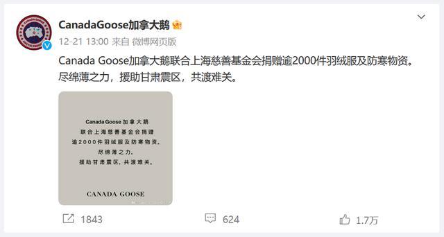 加拿大鹅此前于21日发布消息说,其联合上海慈善基金会捐赠逾2000件羽绒服及防寒物资,并表示“尽绵薄之力,援助甘肃震区,共渡难关。”