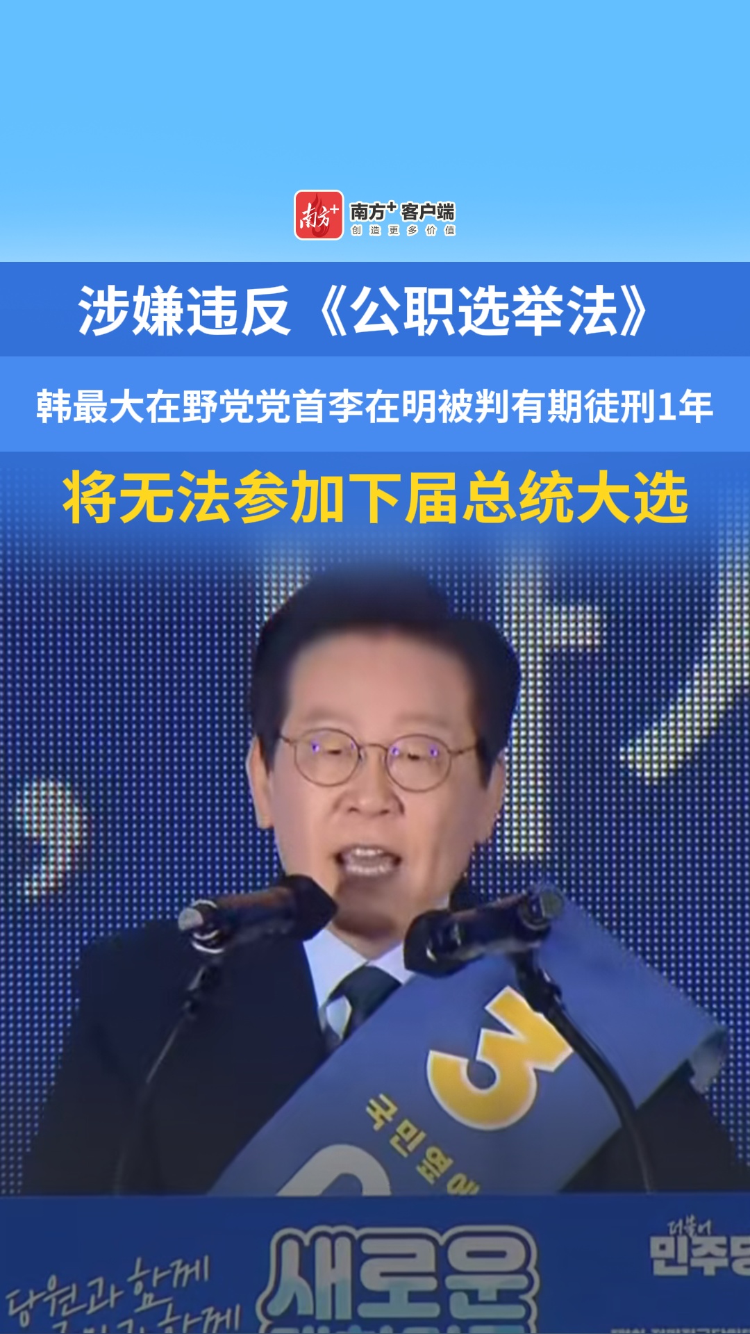 涉嫌违反《公职选举法》,韩最大在野党党首李在明被判有期徒刑1年