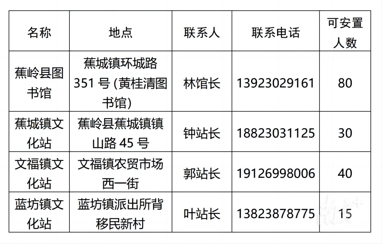 为切实保障人民群众生命财产安排,及时为受灾群众提供应急避护,蕉岭现启用4个公共文旅场所用于临时应急避护,如有需要,请提前与各场所联系人联系。