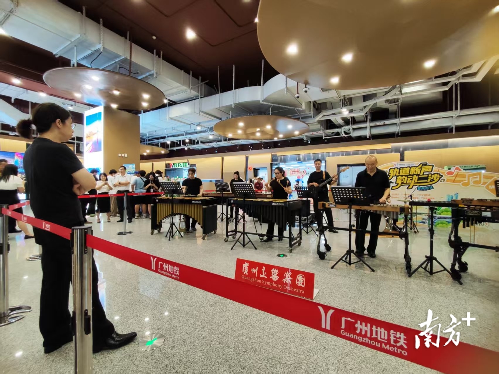 契合站点周边浓厚的文化艺术氛围,在开通当天,广州交响乐团音乐家就在二沙岛站开展主题为“轨道新声·韵动二沙”的音乐沙龙,以打击乐的丰富音色与地铁的速度节奏呼应,演绎“城市节奏·生活律动”主题。广州地铁联合广州交响乐团在二沙岛站B出口通道打造的交响乐岭南文化时空长廊也与公众见面。