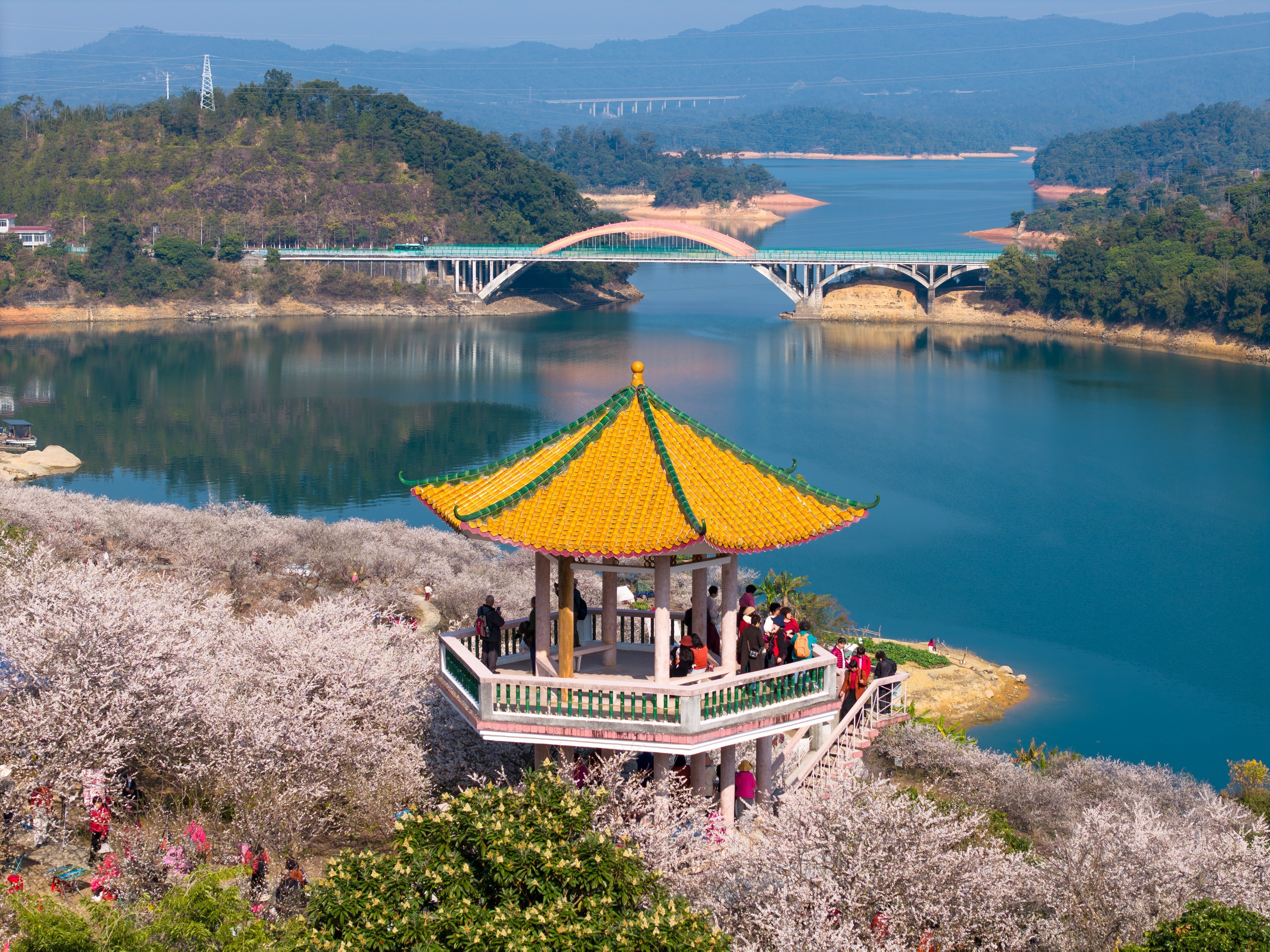 2025年1月8日,广州市流溪河国家森林公园梅花倚着碧色流溪河大片盛开。南方+拍客 罗彩煌 摄