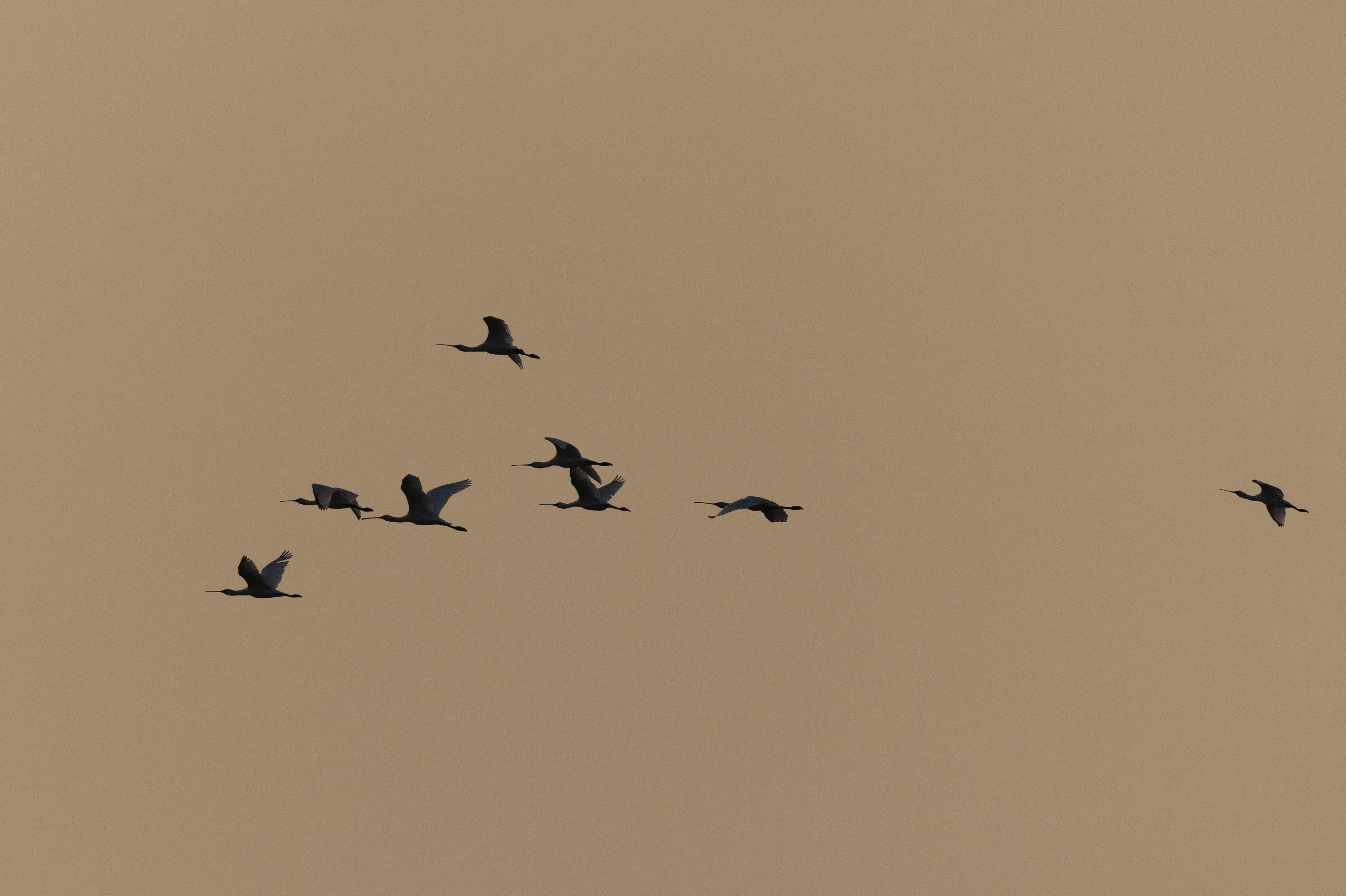 广东湛江,黑脸琵鹭在暖阳中翱翔留下剪影。南方+记者 徐昊 摄