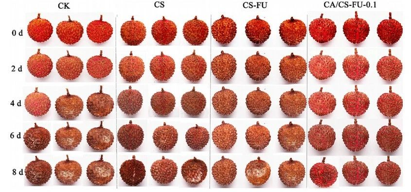岭南师范学院刘锴栋团队利用壳聚糖(CS)和氧化褐藻糖胶(CS-FU)以及包封肉桂醛(CA) 制备的一种可食用复合薄膜可以显著提高荔枝的保鲜时间(>8 天)(文献图片)