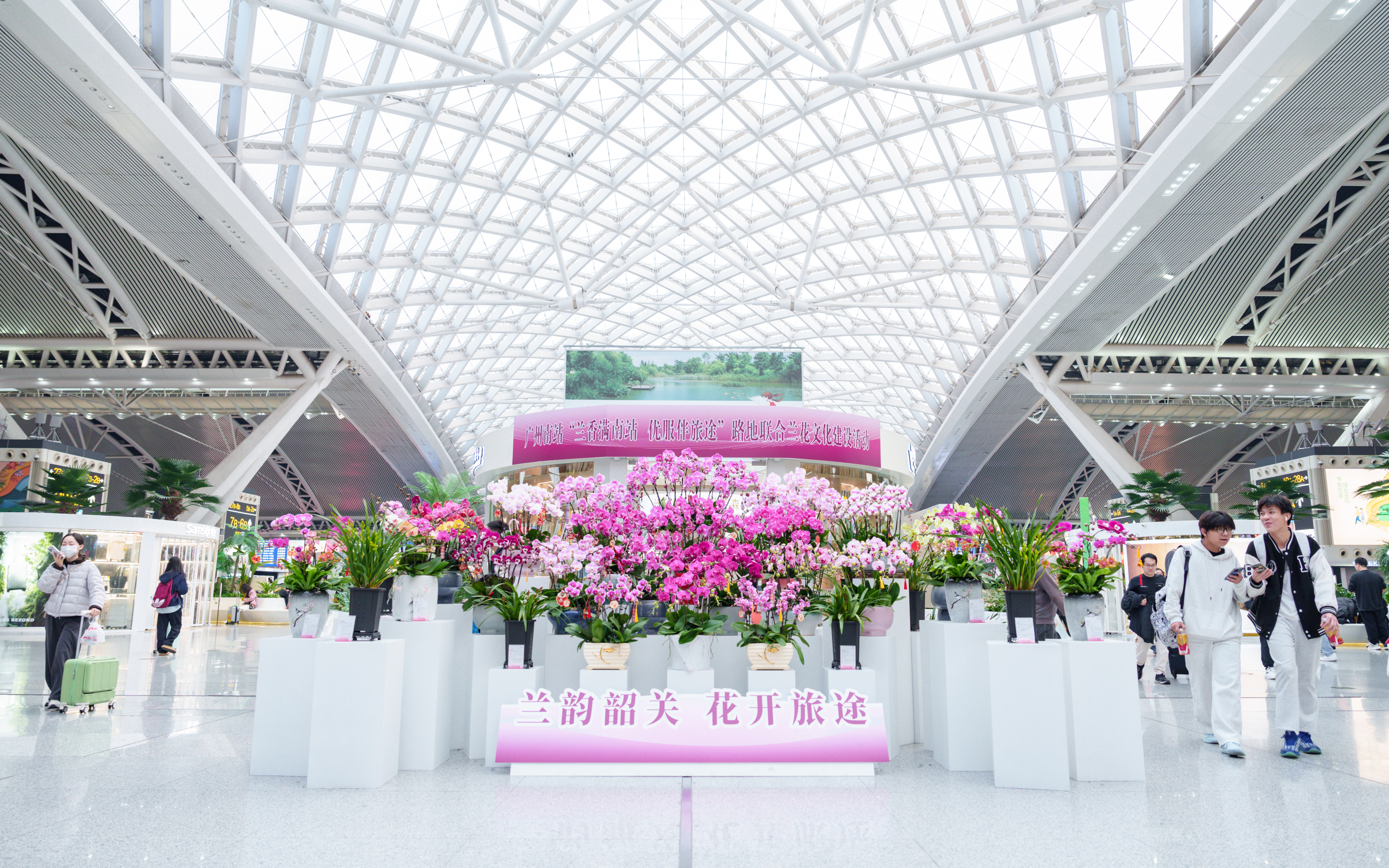 1月1日新年第一天,“兰韵韶关 花开旅途”兰花文化推广系列活动在广州南站举办,在三楼候车厅,各式各样的兰花在大厅展台上静静绽放,引来旅客驻足观赏。