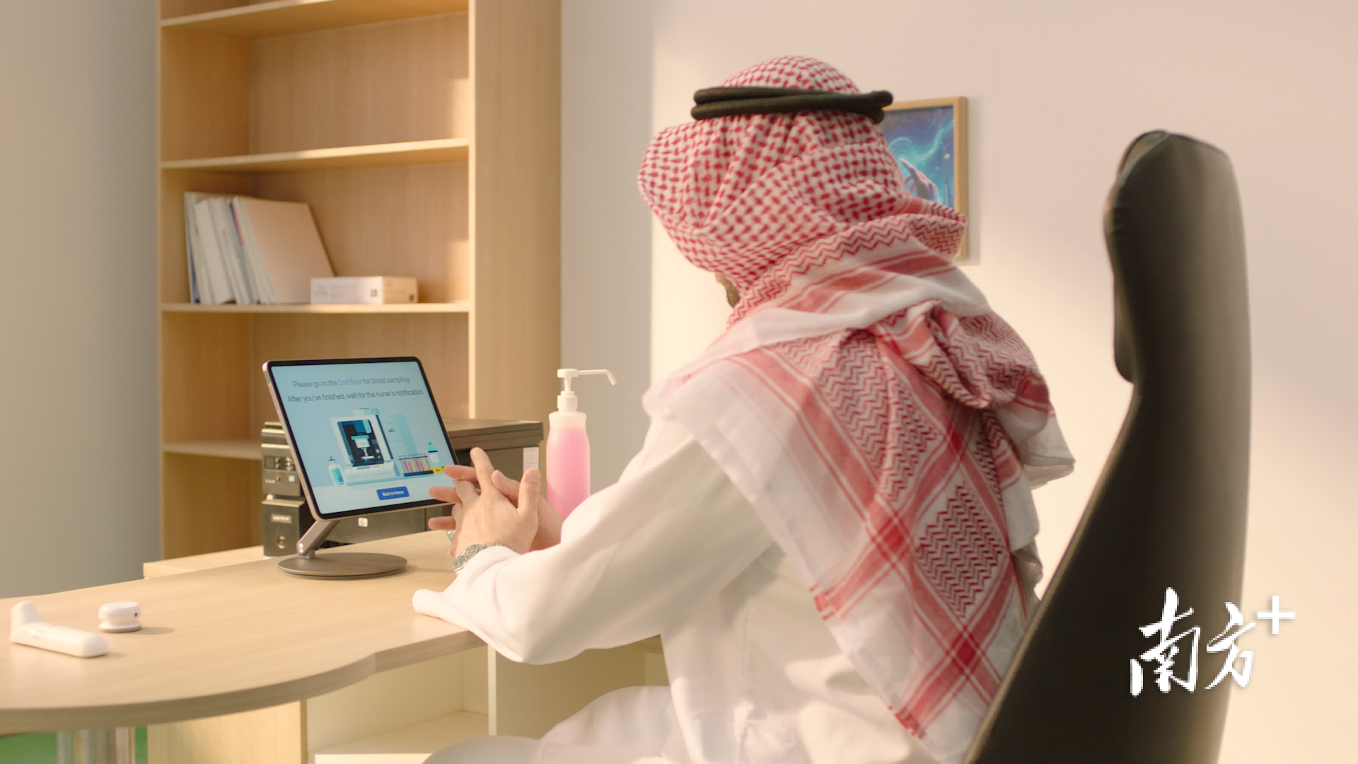 在沙特阿拉伯阿哈撒地区的一家诊所内,患者阿卜杜勒(音译)正经历一次前所未有的就诊体验: