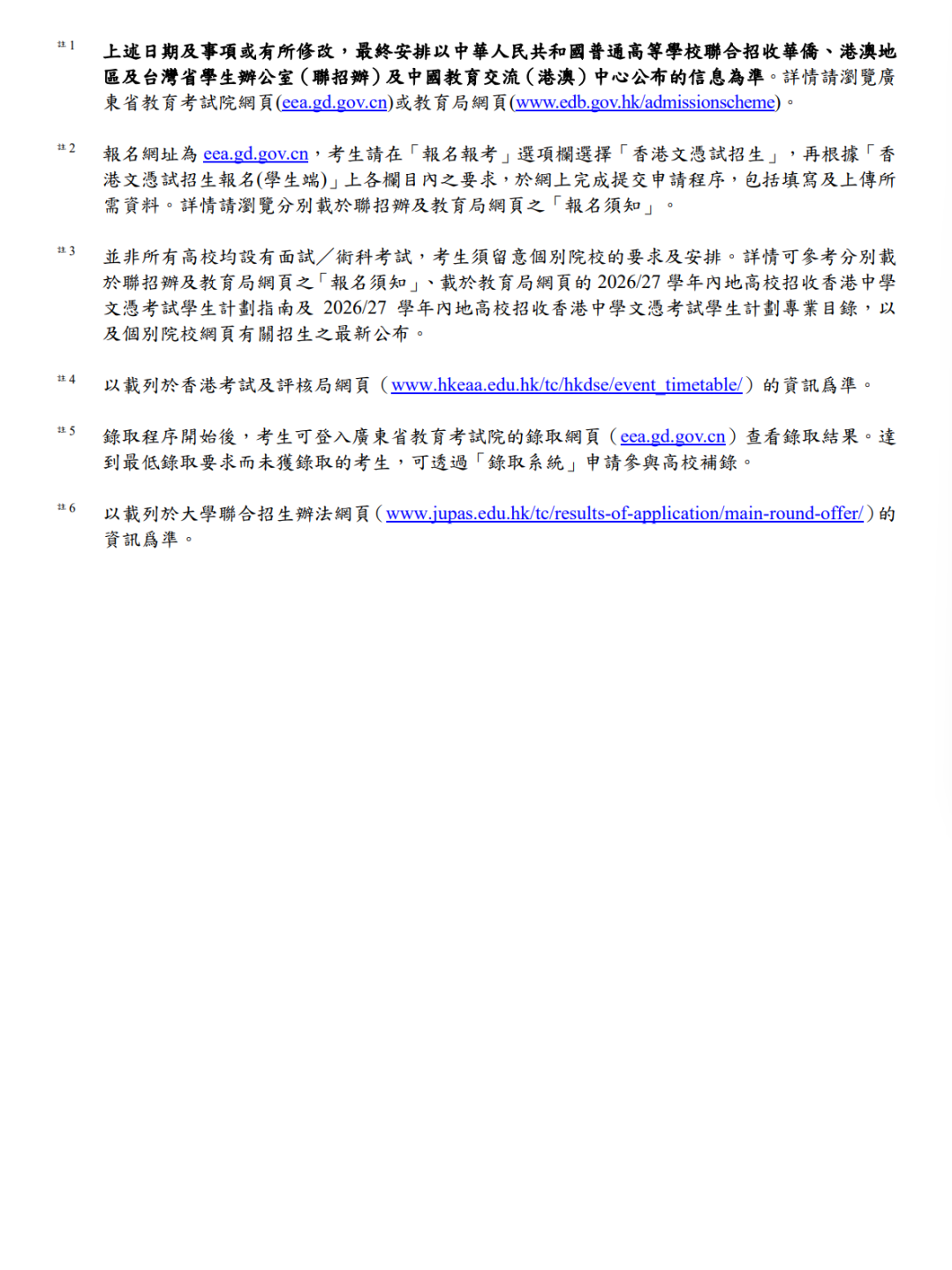 香港特区政府教育局(教育局)欢迎国家教育部公布参与2026/27学年内地高校招收香港中学文凭考试学生计划(文凭试收生计划)的内地高等院校数目将增加至165所。院校分布内地21个省/直辖市及两个自治区,并接受2026年香港中学文凭考试(HKDSE)考生报名。