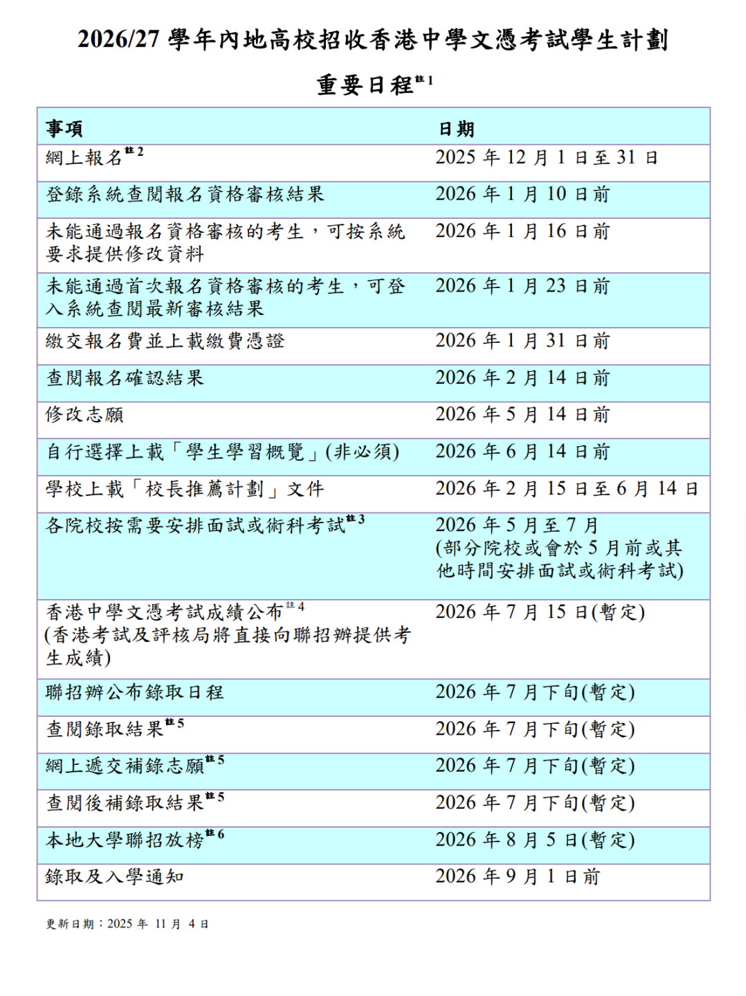 如学生曾按系统要求提供补充资料,则可于2026年1月23日前登入查阅审核结果。所有通过报名资格审核的考生须于2026年1月31日前缴交报名费(港币460元),各参与文凭试收生计划的内地院校随后可根据学生报考资料并按需要安排面试。院校将于2026年7月下旬公布录取名单并根据招生情况安排补录。