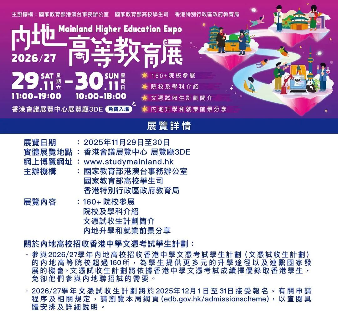 学生、教师和家长亦可亲临由国家教育部港澳台事务办公室、国家教育部高校学生司与教育局合办的“2026/27学年内地高等教育展”了解。2025年的教育展将于11月29至30日(星期六及日)在香港会议展览中心举行。