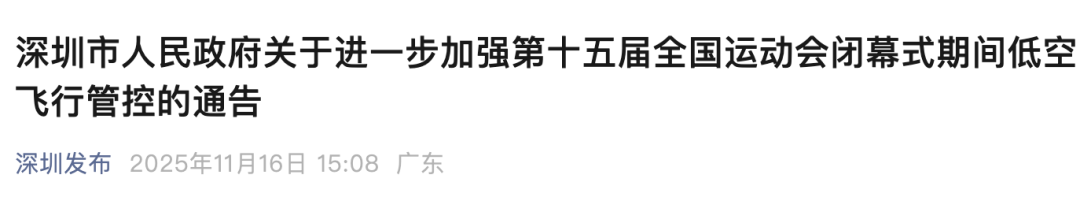 2025年11月21日0时至24时,十五运会闭幕式当日,在深圳市行政区域全域。