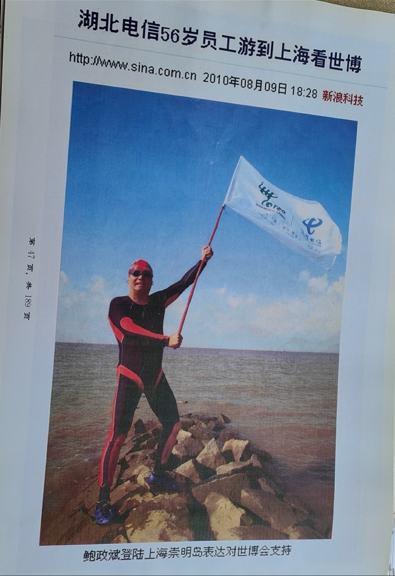 鲍政斌曾从武汉游到上海看世博会。这并非他第一次挑战长距离水上征程。15年前,鲍政斌就曾因从武汉游泳1200公里至上海观看世博会而轰动一时,受到数十家媒体关注。当他在崇明岛故地重游,向前来围观的市民提及此事时,竟有当地老人清晰记得当年盛况,并用手机迅速搜出了他当年的报道,现场气氛热烈。