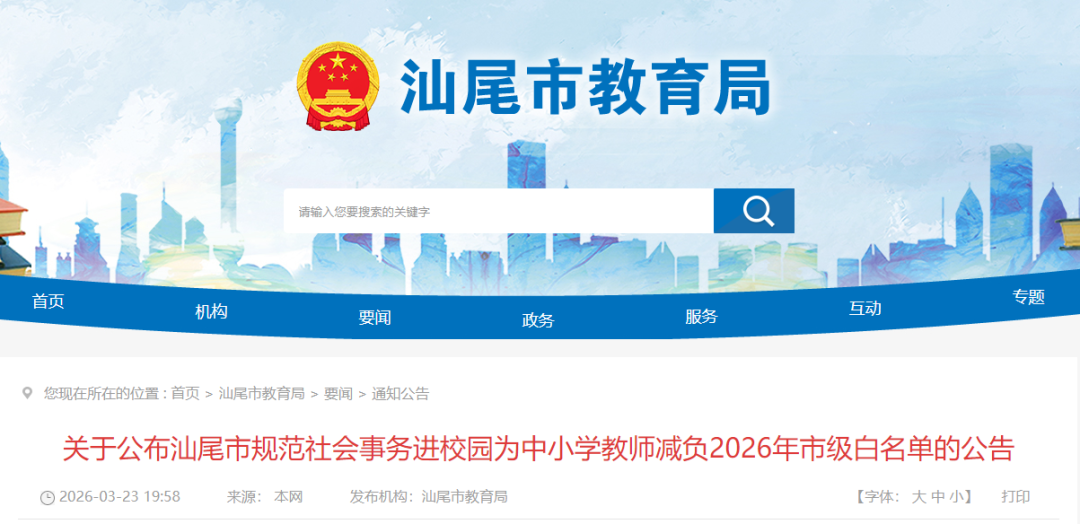 最新消息!汕尾公布规范社会事务进校园为中小学教师减负2026年市级白名单,明确严格执行《广东省规范社会事务进校园为中小学教师减负2026年省级白名单管理事项》(共5项),不再另行增加市级白名单事项。各县(市、区)须严格按照社会事务进校园准入标准制定本级2026年度社会事务进校园白名单,每所学校每学期各类进校园活动不超过6次。